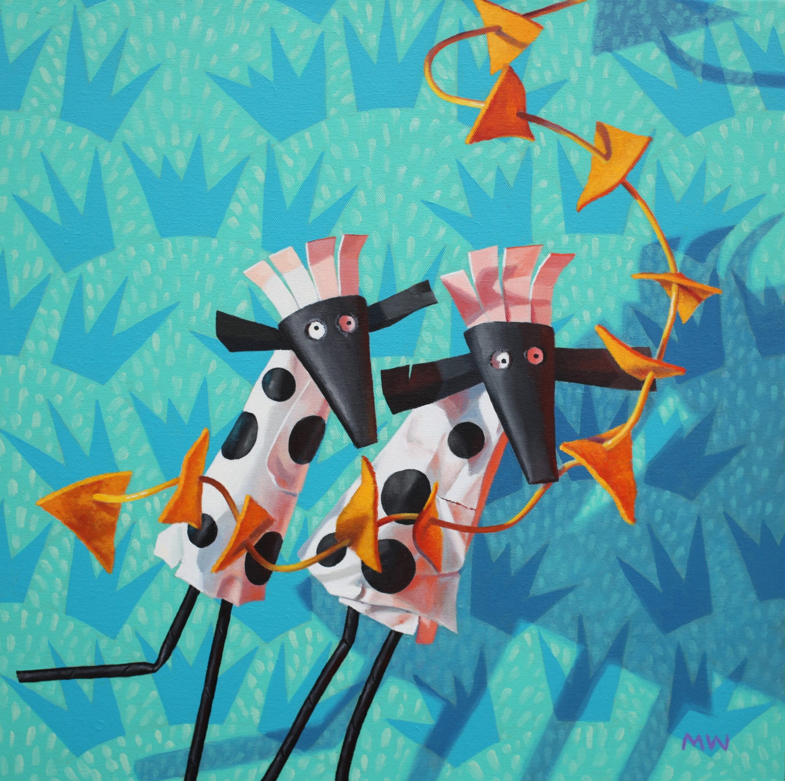 Mark Ward’s paintings emerge from a profound and enduring love of animals encountered both near and far, drawing on wildlife observed in local landscapes as well as during his time living in Africa. From his Suffolk studio, Mark constructs intricate models from paper, string, clay and recycled materials, assembling imagined worlds that reflect the perfectly imperfect nature of life within a contemporary context.