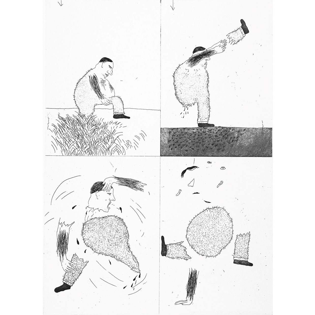 This is one of 39 etchings that Hockney created for the series ‘Six Fairy Tales from the Brothers Grimm’. From the unsigned edition of 400 plus 15 artist’s proofs. The etching plates were hand-drawn by David Hockney in London between May and November 1969, proofed by Maurice Payne and printed by Piet Clement on W.S.Hodgkinson paper. Published by the Petersburg Press in association with the Kasmin Gallery in 1970.