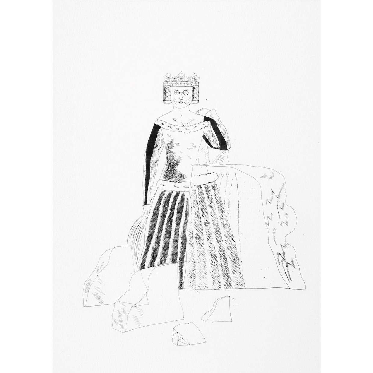 This is one of 39 etchings that Hockney created for the series ‘Six Fairy Tales from the Brothers Grimm’. From the unsigned edition of 400 plus 15 artist’s proofs. The etching plates were hand-drawn by David Hockney in London between May and November 1969, proofed by Maurice Payne and printed by Piet Clement on W.S.Hodgkinson paper. Published by the Petersburg Press in association with the Kasmin Gallery in 1970.
