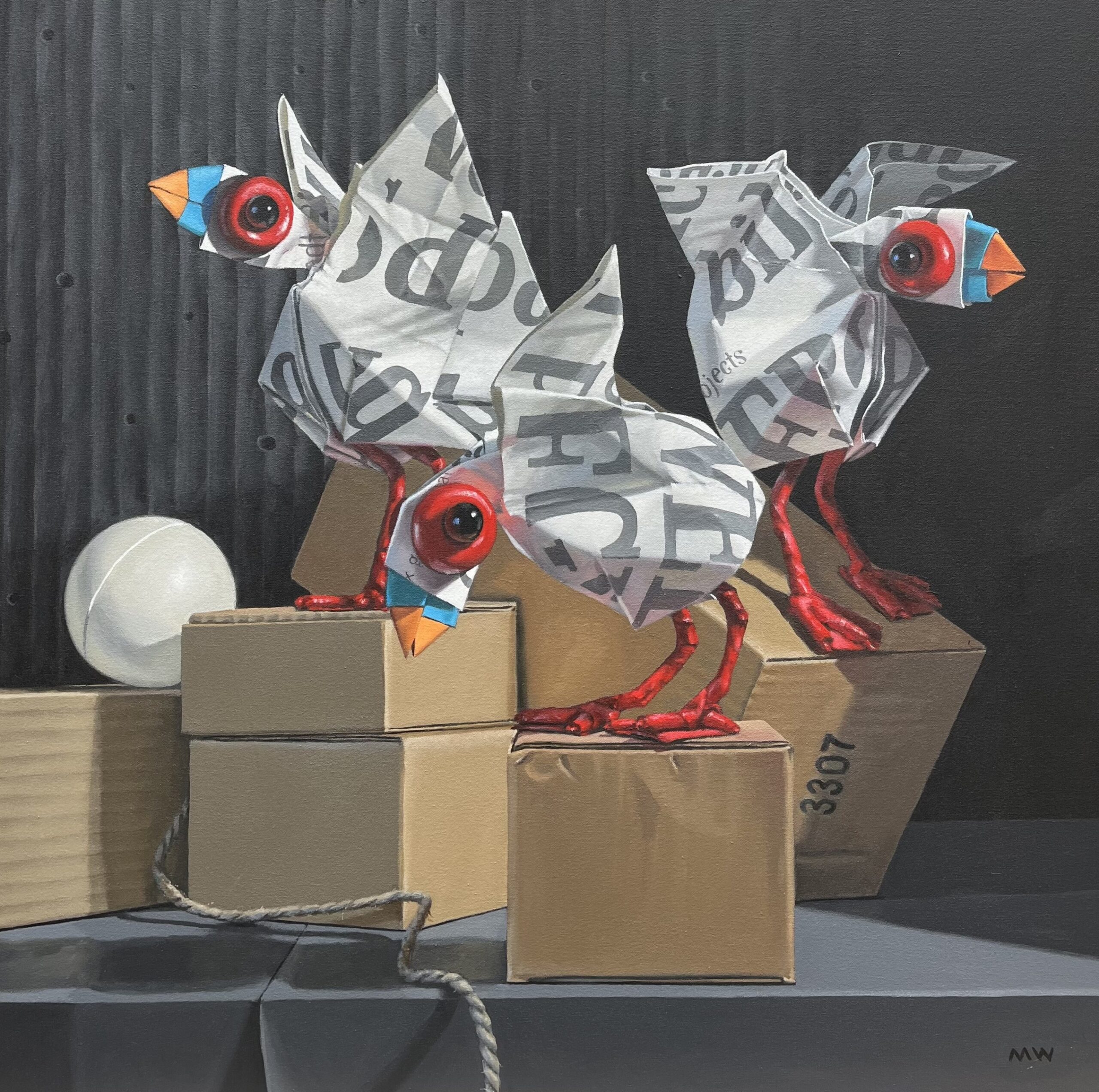 Mark Ward’s paintings emerge from a profound and enduring love of animals encountered both near and far, drawing on wildlife observed in local landscapes as well as during his time living in Africa. From his Suffolk studio, Mark constructs intricate models from paper, string, clay and recycled materials, assembling imagined worlds that reflect the perfectly imperfect nature of life within a contemporary context.